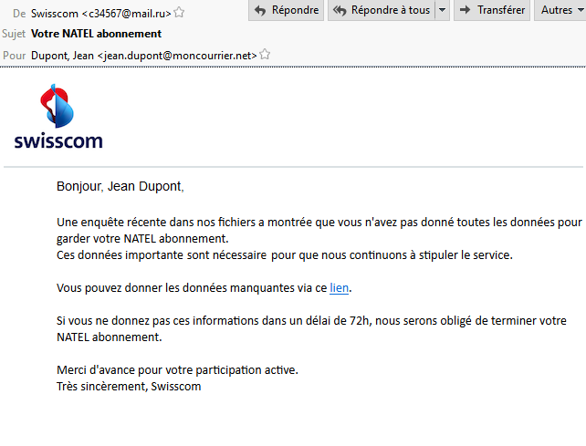 L'adresse de l'expéditeur ne correspond pas exactement à ce que l'on pourrait attendre (Swisscom vs c34567@mail.ru)
